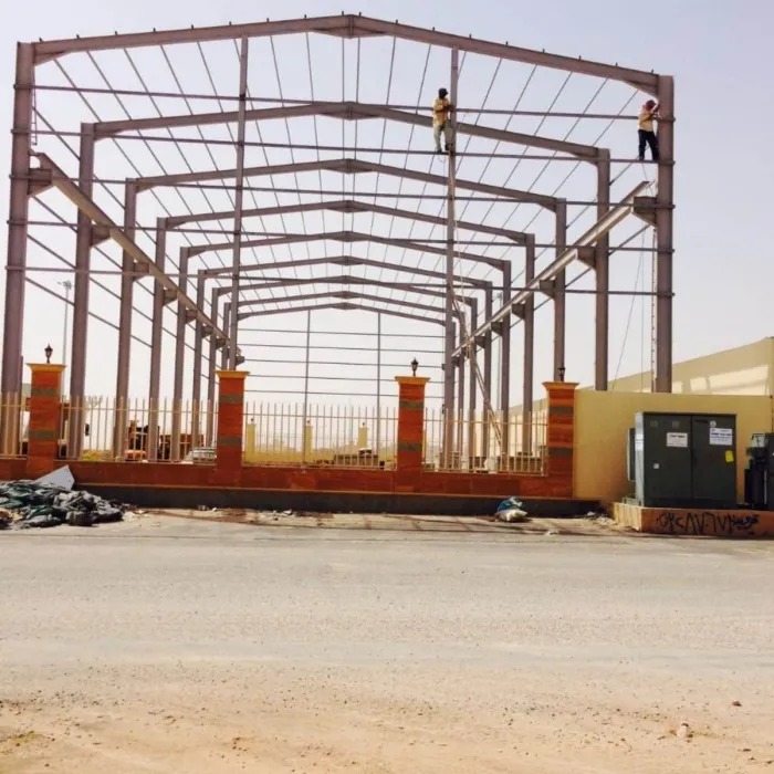 نصب الهيكل الحديدي: تركيب الأعمدة والجسور (الجمالونات) وربطها ببراغي عالية القوة.