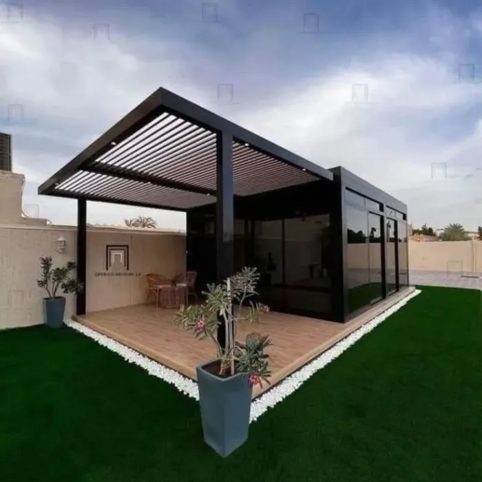 برجولات مودرن: تتميز بالخطوط النظيفة والتصميم البسيط، وغالباً ما تكون مربعة أو مستطيلة.