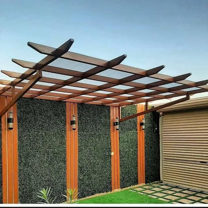 البرجولات المغلقة جزئياً (اللكسان): يمكن تغطية سقف البرجولة بألواح اللكسان (Polycarbonate) التي تسمح بمرور الضوء الطبيعي مع حجب الأشعة فوق البنفسجية والحرارة، مما يجعلها مثالية لحماية المكان دون عزل إضاءة الشمس.