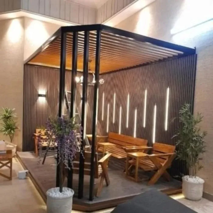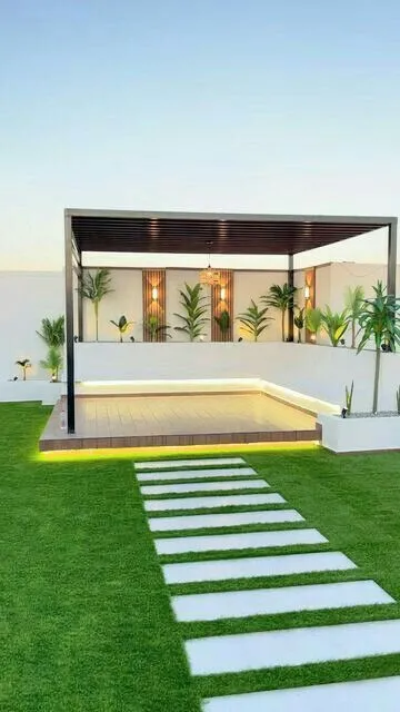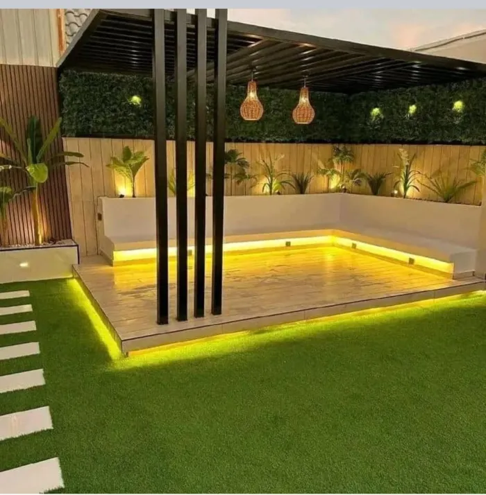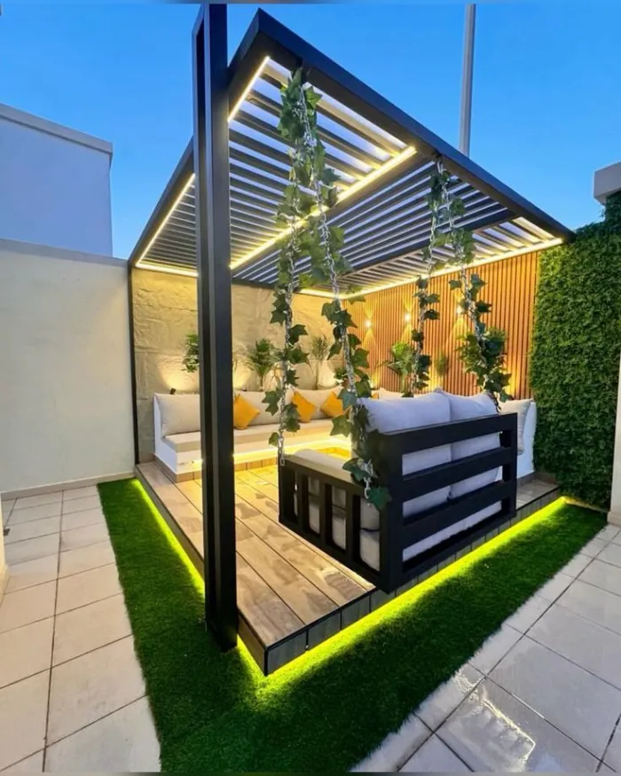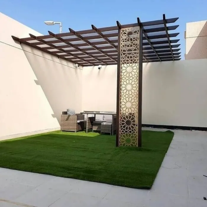 الإضافات الجمالية: لاكتمال المنظر، يمكن تزيين البرجولات بـنباتات متسلقة لخلق مظهر طبيعي خلاب، أو بـوحدات إضاءة خافتة (إنارة مخفية) لتحويل الجلسة إلى ركن ساحر في المساء.