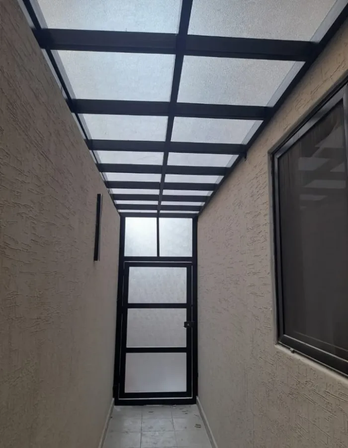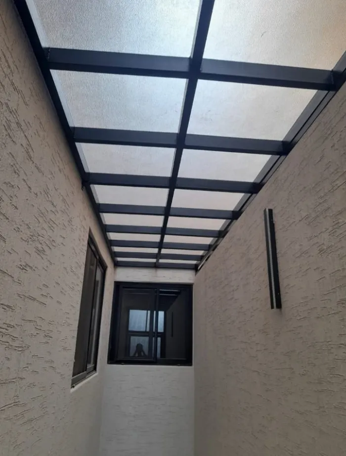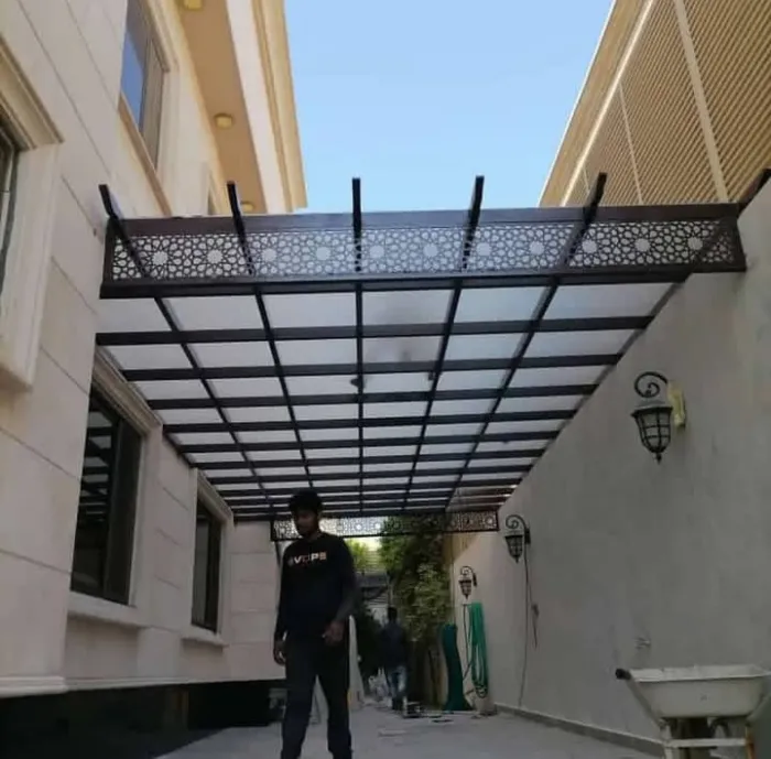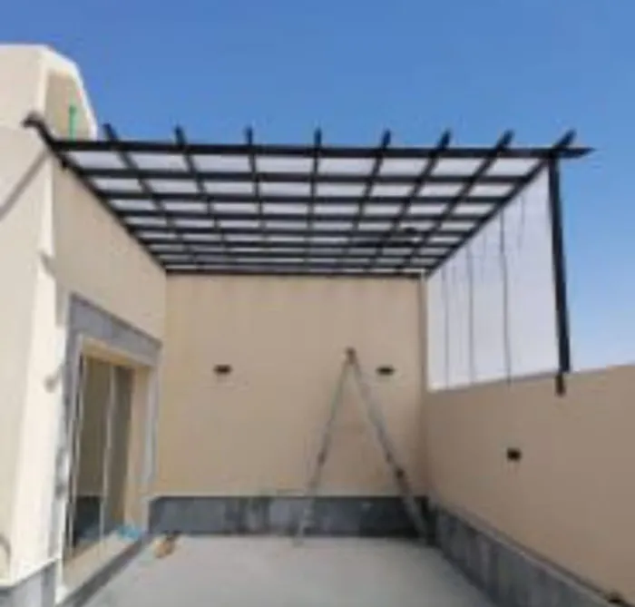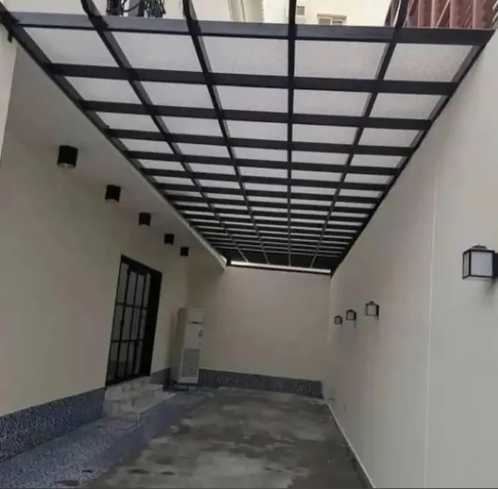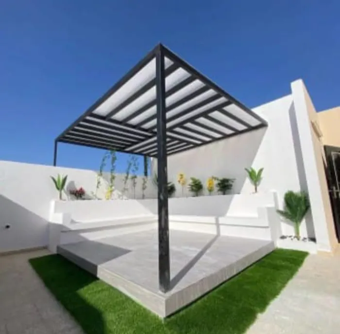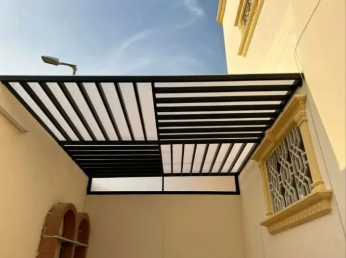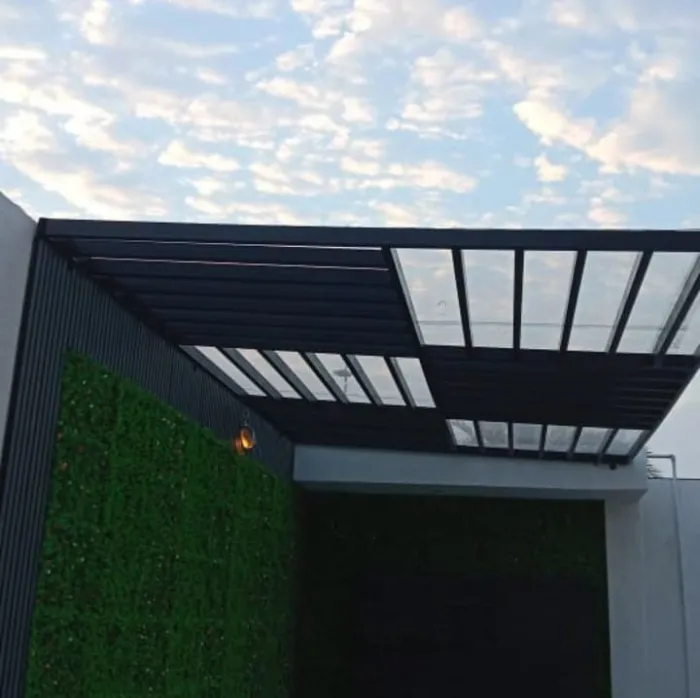الميزة: توفر حماية كاملة من المطر والشمس مع إمكانية تمرير الضوء الطبيعي، وهي مثالية لتغطية مواقف السيارات أو المساحات التي تُستخدم كصالة معيشة خارجية.